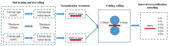 The chemical composition of two different high-grade non-oriented silicon steel is shown in Table 1. The Si content of the 1# hot-rolled sheet is 3.02%, and the Si content of the 2# hot-rolled sheet is 2.54%. Using the same heating and hot rolling process, two different high-grade non-oriented silicon steels with different Si content were hot-rolled from 220 mm to 2.30 mm coil, and then normalized, cold-rolled, and annealed. The heating temperature of the cast slab was 1150 °C, the normalization temperature of sample 1 was 850 °C and sample 2 was 920 °C, and the normalization time of both samples was 3 min; finally, the cold-rolled sheets were annealed at 980 °C with a different interval of 3 s, 7 s, 15 s, 19 s, 23 s and 25 s, respectively, and the annealing atmosphere was 75% N2 and 25% H2. The detailed production process routes are shown in Figure 1.