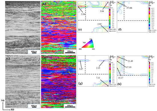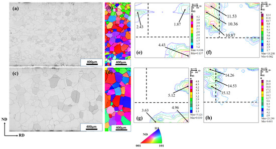 Microstructure (a,c), grain orientation image map (b,d), and macro-texture at surface region (e,g) and center region (f,h) of normalized sheets (corresponding normalization temperature were 850 °C and 920 °C, respectively) with 3.02% Si content (upper) and 2.54% Si content (lower).