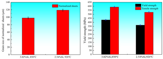 The following supporting information can be downloaded at: https://www.mdpi.com/article/10.3390/cryst12050593/s1, Table S1: Grain size of normalized sheets with different Si content and normalization temperature; Table S2: Mechanical properties of normalized sheets with different Si content and normalization temperature; Table S3: Recrystallization fraction of the cold rolled sheet of 3.02% Si and normalized at 850 °C; Table S4: Recrystallization fraction of the cold rolled sheet of 2.54% Si and normalized at 920 °C.