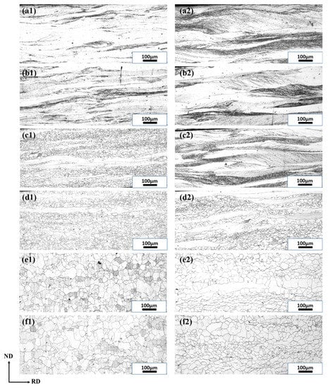 Recrystallization microstructure evolution of the cold rolled sheets of 3.02% Si content (left) and 2.54% Si content (right) for different intervals: (a1,a2) 3 s; (b1,b2) 7 s; (c1,c2) 15 s; (d1,d2) 19 s; (e1,e2) 23 s; (f1,f2) 25 s.