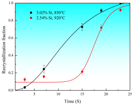 Comparison of recrystallization fraction of the cold-rolled sheets of different Si content with different normalization temperature. The detailed statistical information is in Tables S3 and S4.