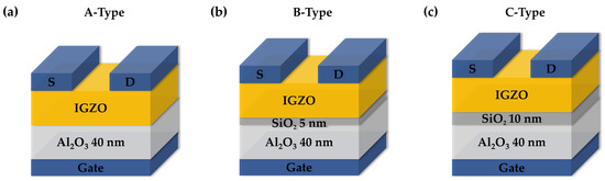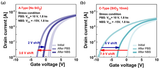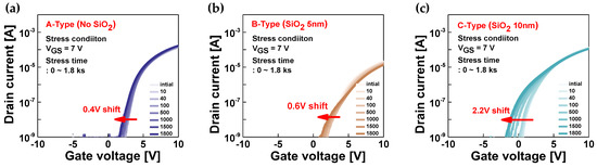 I-V characteristics of (a) A-type, (b) B-type, and (c) C-type IGZO TFTs under a positive bias stress (PBS). When the thickness of the SiO2 layer is sufficiently wide, a significant threshold voltage shift occurs in the PBS condition.