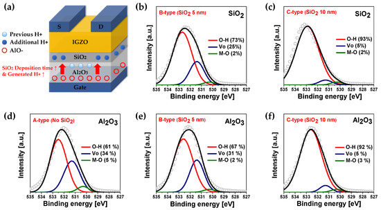 Illustration of hydrogen movement in the Al2O3, SiO2 layer during the gate insulator deposition. (a) Schematic view of the IGZO synaptic TFTs with hydrogen movement by deposition process. O 1 s XPS spectra of Al2O3 layer in (b) B-type and (c) C-type IGZO synaptic TFTs in the SiO2 layer. O 1 s XPS spectra of Al2O3 layer in (d) A-type, (e) B-type, and (f) C-type IGZO synaptic TFTs in Al2O3 layer.