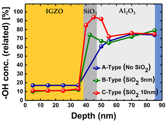 Moreover, we performed the additional XPS depth profile analysis of the entire stack for the IGZO TFTs to analyze the movement of hydrogen in detail during the gate insulator deposition step. Figure 4 summarizes the proportion of hydroxide in the total XPS depth profile analysis for the A-, B- and C-type devices. First, the hydrogen content in the IGZO channel of all the devices is lower than that of either the SiO2 or Al2O3 layer for the entire depth region. This is because the bond dissociation energy of Si-H (318 kJ/mol) and Al-H (285 kJ/mol) is higher than In-H (243 kJ/mol), Ga-H (274 kJ/mol), and Zn-H (85 kJ/mol), so the additionally generated hydrogen in the Al2O3 layer during the deposition process is hard to move toward the IGZO channel [44,45]. In addition, since hydrogen combines with oxygen to form an O-H bond when hydrogen reaches the IGZO interface, a large amount of hydrogen cannot move into the IGZO channels. Inside the SiO2 layer, the hydrogen content of the C-type device is much higher than that of the B-type device in all the regions. This is because the hydrogen content increases with the increased SiO2 deposition thickness because the existing Al-H bond is broken and injected into the SiO2 layer during the deposition step as discussed in Figure 3b,c. At 5 nm depth of the Al2O3 layer, the hydrogen content of the C-type is much higher than that of the A- and B-type devices. However, as the depth increases, there is no significant difference in the hydrogen content depending on the device type. This is because additionally generated hydrogen during the SiO2 deposition step moved into the SiO2 rather than the Al2O3 layer due to the difference in bond dissociation energy between Si-H and Al-H.