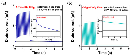 Figure 6a,b shows the retention characteristics after applying 16 potentiation pulses of VGS = 8 V with a width of 100 ms to the A- and C-type IGZO TFTs, respectively. After all the potentiation pulses are applied, both the drain current of both devices is slowly recovered to the initial state, indicating that hydrogen move inside the Al2O3 and SiO2 layer. However, the drain current of the A-type decreases rapidly, while that of the C-type remains higher than the initial value for 4 s after applying 16 potentiation pulses. The drain current of the A-type device decreased to almost the initial state (96% drop) for 4 s, but the C-type device maintained the drain current (27% drop) for 4 s. This is because the migration velocity of hydrogen in SiO2 is slower than that in Al2O3 [47], which implies that the insertion of the SiO2 layer improves not only the VT modulation window but also the retention characteristics.