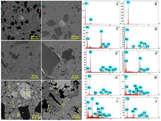 Figure 4 demonstrates the designated points for pointwise EDS point and planar analyses of sample 6. Quantitative results at Point A indicate that the highest weight percent is for graphite (dark black). The second peak, which is weaker, is sulfur. In the figure, the large black dots (Point B) correspond to SiC particles. Furthermore, at the EDS point, it is observed that silicon and carbon form the highest weight percent (65% and 34%, respectively). The analysis of this point shows that the simultaneous presence of Si and C at this point is the same combination of SiC in the raw material with 6% by volume, which accounts for the total weight percent at this point. Thus, this is the same as SiC. Point C represents the Fe matrix, the element with the highest abundance in the composite. Very small amounts of oxygen and manganese (Mn) are observed at this point (the average volume percentage of Fe is 70%, i.e., the highest percentage, and the presence of Mn can probably be attributed to impurities in the raw materials). Point D analysis shows Cu with about 96%. At Point E, tungsten (W) is seen with the highest weight percent (i.e., 91.63%). It can be observed that this element has agglomerated at this particular point. It is concluded that the distribution is not uniform at this point. The tendency to aggregation is increased by the adsorption of particles to each other at this point, probably due to fine tungsten particles and the specific surface area above them. The presence of 7.62% carbon at this point, together with tungsten, forms the composition of WC (tungsten carbide), which is present in 2% of the composite produced in sample 6. It increases the wear resistance due to the formation of carbide. At Point F, there is a mixture of elements, such as Fe (67%), Cu (about 3%), O (28%), etc., along with small amounts of Mn. Due to the percentages mainly containing Fe and O, the combination of Fe and O has formed iron oxide at this point. At Point I, BaSO