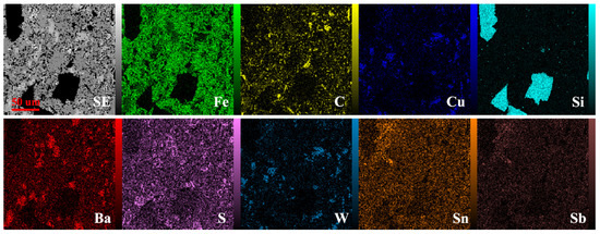 Figure 5 illustrated the elemental map analysis of sample 6. The results indicate the optimal uniform distribution of alloying elements in the Fe-based metal matrix and the uniform formation of the composite. Based on the figure, we can clearly observe W and Si distribution, which is related to the WC and SiC phases, respectively. Furthermore, surface distributions of Cu particles in the Fe matrix are clearly visible. The presence of wear debris and other additives to the Fe matrix in the composite was demonstrated.