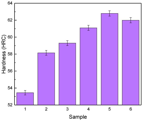 Figure 7. SiC has higher hardness than Fe; therefore, the hardness of the samples increases due to an increase in SiC content relative to the Fe matrix. Increased hardness by increasing the percentage of SiC can be attributed to the effective load transfer from the matrix to the reinforcement. Furthermore, SiC particles act as a barrier against the movement of dislocations, which increases the composite strength. For example, sample 1, with the highest abundance of Fe, is the worst sample in terms of hardness. Sample 5, with the lowest abundance of Fe, has a relatively high hardness. In other samples (e.g., Samples 2 and 4), the hardness is altered by simultaneous changes in SiC and Fe. Hardness is increased by increasing the SiC content and at the same time decreasing Fe.