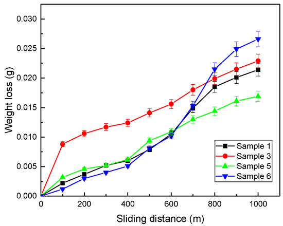 Sample 3 has the worse start, and initially does not seem to have good wear resistance. However, at the end of the test, it exhibits better performance and less weight loss than sample 6 (i.e., 1000 m). Sample 5 has the best performance, the change in weight loss at 1000 m is approximately equal to 0.0169 g, indicating a low weight loss, which is due to the presence of the wear resistance SiC particles. Considering that sample 5 has the best wear performance and has the highest hardness, the results are in confirmation with Archard’s law. This behavior is also due to the reduction in the load applied by the pin to the matrix of the composite, which is tolerated by the SiC particles. This factor causes the depth of the wear-affected surface to have a significant reduction in wear, and the rate of plastic deformation decreases. In addition, due to the increase in the ceramic particles’ content in contact with the pin, the metal–metal contact decreases, which is a reducing factor in the wear rate. Furthermore, thermally dislocation punching, dislocation interaction, work hardening, and geometric constraints arising from SiC particles cause strengthening effects and a reduction in the wear rates.