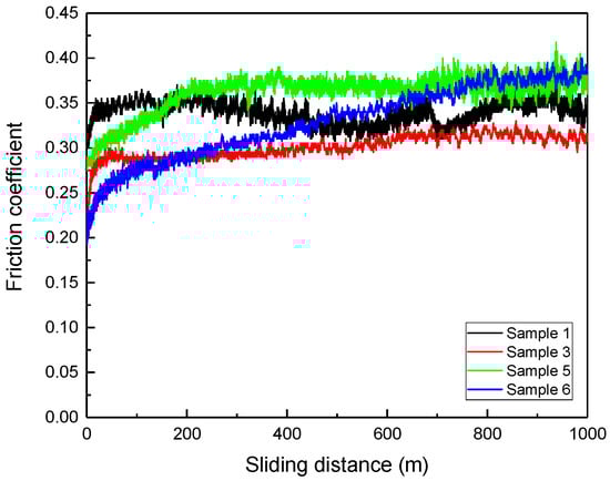 Figure 9). In sample 5, the slope of the diagram is initially small, but it gradually increases. Nevertheless, the diagram and COF are stable from approximately 200 m to the end of the test, stabilized at 0.35. Sample 6 has a low COF (about 0.2) at the beginning of the test. The higher the distance, the higher the COF, and the higher the slope. At the end of the test (i.e., at a distance of 1000 m), it has the highest COF in this study.