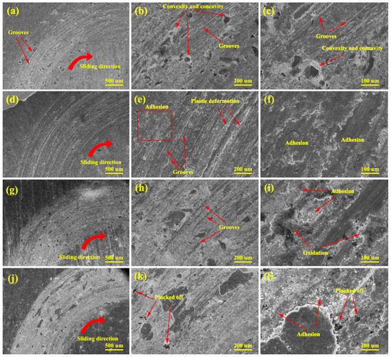 Figure 10d–f show the worn surface of sample 3. As can be seen, the wear mechanism in sample 3 is a combination of abrasive and adhesive wear.