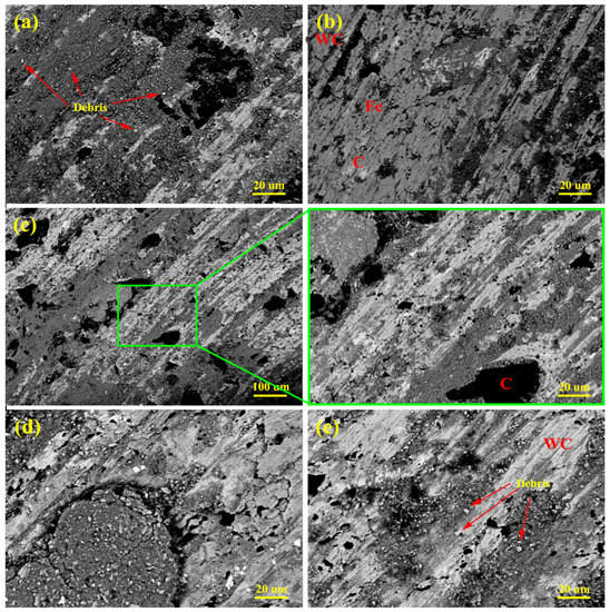 Figure 4 illustrates how WC is distributed in a composite. As shown in this figure, the WC particles are separated into pieces within the matrix of the sample and placed on the wear surface between the two contact surfaces. Like sandpaper, this wear debris leads to abrasion of the piece and the formation of a wear layer.