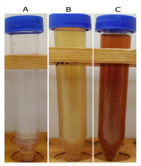 Change in the color of silver nitrate solution after addition of Origanum majorana aqueous leaf extract. (A): colorless silver nitrate solution; (B): Origanum majorana aqueous leaf extract; (C): dark brown color indicates formation of silver nanoparticles.