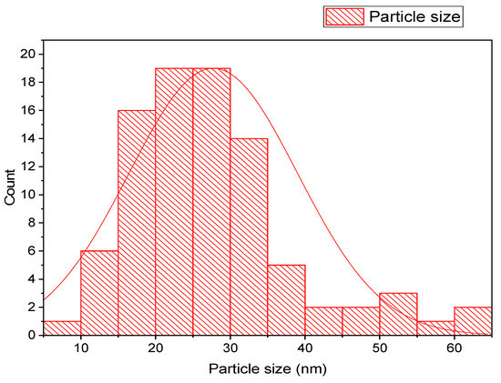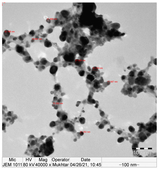 Transmission electron microscope (TEM) analysis has been reported as the most accurate technique for the determination of AgNP size [44,45]. Electron micrographs of AgNPs showed that these nanomaterials were spherical in shape, polydispersed, and that their average size diameter ranged from 10–60 nm, as seen in Figure 3. Moreover, Figure 4 shows the AgNP size distribution histogram, which reveals that AgNP size was within permissible limits, with an average particle size of 26.63 nm. The biogenic silver nanoparticles were smaller than those described in a recent work in which Phyllanthus emblica fruit extract promoted green production of silver nanoparticles with an average diameter of 39.1 nm [46]. Larger sizes of green synthesized silver nanoparticles using fresh Arbutus unedo leaf extract have been reported, with typical size diameters ranging from 40 to 58 nm [47]. Overall, prior results confirm that utilizing aqueous leaf extract of O. majorana to synthesize silver nanoparticles is an eco-friendly and high-efficiency approach, as demonstrated in our current investigation.