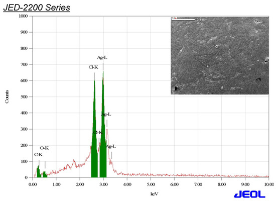 Energy dispersive X-ray spectroscopy (EDX) analysis was implemented to detect the elemental mapping of the biogenic AgNPs. EDX analysis showed the presence of the following elements: oxygen (3.69%), carbon (2.93%), aluminum (1.29), silicon (2.83%), chloride (17.89%), and silver (71.37%), as seen in Figure 5. Moreover, an intense peak was observed at 2.98 keV, indicating the presence of silver (Ag), while the intense peak formed at 2.62 keV confirmed the presence of chloride (Cl). Aluminum (Al) and silicon (Si) elements were ascribed to the two additional peaks found at 1.486 and 1.739 keV, respectively. Our findings were in accordance with those of Okaiyeto et al., 2019, who detected the elemental composition of AgNPs synthesized using aqueous leaf extract of Oedera genistifolia, showing the presence of silver and chloride elements [48]. Furthermore, Benincasa hispida peel extract and Momordica charantia leaf extract mediated green synthesis of silver nanoparticles with the presence of chloride element according to EDX analysis, and these results were coincident with our findings [49,50]. Chlorine (Cl−) ions are plentifully existent in plants, and play a dynamic role through photosynthesis and keeping overall homeostasis [51]. Collectively, different elements detected by EDX analysis, such as Si, Al, and Cl, were reported to act as capping agents of the biogenic AgNPs according to a previous study [52].