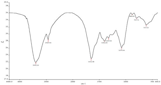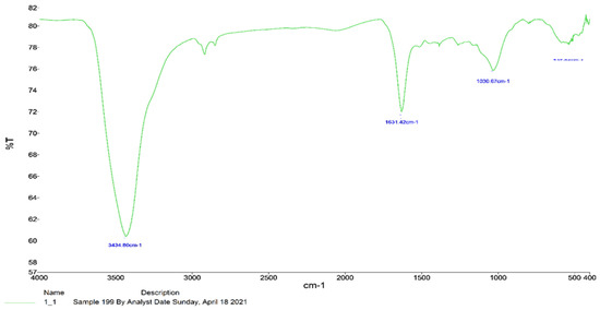 The distinct functional groups accountable for the reduction and stability of silver nanoparticles were investigated using FTIR analysis. FTIR analysis of aqueous leaf extract of O. majorana revealed the presence of vibrational frequencies at 3399.10, 2929.94, 1652.38, 1402.20, 1325.04, 1079.44, 880.06, 797.71, and 615.21 cm−1, as seen in Figure 6. On the other hand, the biogenic AgNPs synthesized using O. majorana leaf extract showed vibrational frequencies at 3434.80, 1631.42, 1030.67, and 537.82 cm−1, as seen in Figure 7. The broad bands at the vibrational frequencies of 3390 and 3434 cm−1 of both plant extract and biogenic AgNPs were assigned to the presence of hydroxyl functional group, corresponding to phenolic compounds [53]. In this context, the hydroxyl functional groups detected in O. majorana extract were believed to be accountable for silver ions reduction to metal silver through alcoholic oxidation (R-OH) to form an aldehydic group (R=O) as demonstrated in the equation