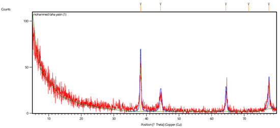 The crystalline nature of AgNPs was examined using X-ray diffraction analysis (XRD) of the dried powder of AgNPs. The XRD pattern revealed the presence of four diffraction peaks at 2 theta (θ) degrees of 38.18°, 44.36°, 64.35°, and 77.54°. The diffraction peaks detected at 2 theta (θ) of 38.18°, 44.36°, 64.35°, and 77.54° corresponded to the planes of silver crystals (111), (200), (220), and (311), respectively, as seen in Figure 8. Accordingly, these findings confirmed the synthesis of face-centred cubic (fcc) and crystalline AgNPs [59]. Our findings were consistent with those of Al-Aboody 2019, who reported the formation of the fcc structure of AgNPs as a result of Bragg reflections at 28.0°, 32.4°, 46.4°, 54.9°, 57.7°, and 64.7°, which corresponded to the planes (111), (200), (220), (311), (222), and (400), respectively, as stated by the Joint Committee on Powder Diffraction Standards (JCPDS), file No. 04-0783 [60].