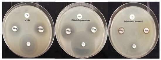 Three nosocomial bacterial strains were tested for susceptibility to the silver nanoparticles: methicillin-resistant Staphylococcus aureus (ATCC 33592), Klebsiella pneumoniae (ATCC 700603), and Acinetobacter baumannii (ATCC 43498). The bacterial isolates were subcultured over Mueller–Hinton agar (MHA) incubated for 48 h at 35 °C to attain fresh inoculums.