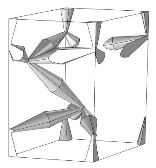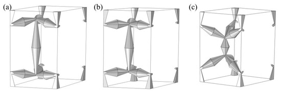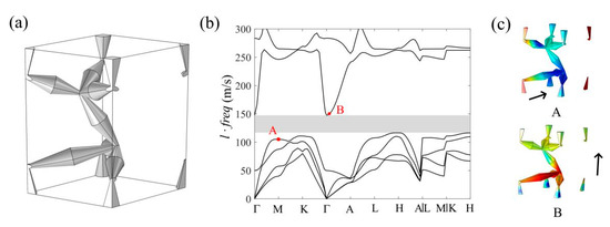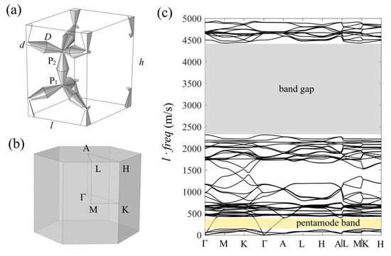 The Brillouin zone of the primitive cell is shown in Figure 1b, and the irreducible Brillouin zone is denoted. The band structures of the primitive cell are calculated around the irreducible Brillouin zone to show its properties. Finite element analysis software COMSOL Multiphysics is used in the calculation. The three groups of counterpart boundaries of the primitive cell are set as Floquet periodic conditions, and the free tetrahedral method is used in the meshing. The Cauchy Momentum Equation is used to solve the eigenfrequencies of the cells, which is