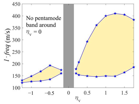 The variation in the structures of the primitive cell affects the pentamode bands. The relationship of the pentamode bands with ηv is shown in Figure 3, where the other parameters are d = 0.02l and D = 0.1l. It can be seen from the figure that there are pentamode bands no matter whether ηv < 0 or ηv > 0, but the band widths are much larger when ηv > 0. The largest band width appears around ηv = 1.25. It can also be seen that there is no pentamode band around ηv = 0. That means the pentamode band disappears when three arms of one connection point are almost at one plane. The band structures of the cell with ηv = 0 are shown in Figure 4a, where it can be seen that there is no frequency range where only compressional modes exist. Four specific modes along the ΓM direction are shown in Figure 4b. The compressional mode is accompanied with shear modes at all frequencies.
