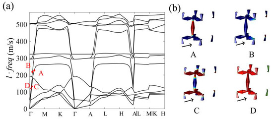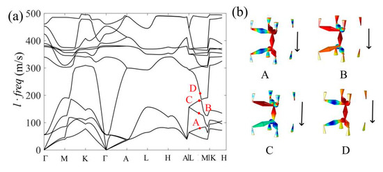 The band structures (a) and specific modes (b) of the varied cell with ηh = 0.3.