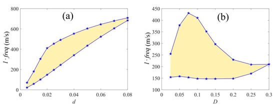 The effects of geometric parameters on pentamode bands are also studied. The effects of d on the pentamode bands are shown in Figure 5a with ηv = 1.25 and D = 0.1l. It is known that a larger d value increases the stiffness. Thus, the lower limit and the upper limit of the pentamode band both increase with d. In contrast, too large and too small d values both narrow the pentamode band width. The effects of D on the pentamode bands are shown in Figure 5b with ηv = 1.25 and d = 0.02l. The parameter D mainly affects the effective mass, so the band width increases with the decrease in D. However, too small D also weakens the stiffness, which narrows the pentamode band width. Therefore, proper geometric parameters are required if a wide band width of pentamode bands is desired.