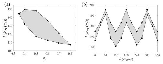 The effects of structural parameters ηc and θ on band gaps are studied for the primitive cell with d = 0.02l, D = 0.1l. The relationship of a band gap with ηc when θ = 0 is shown in Figure 10a. The band gap only appears in the range of 0.35 to 0.8. There is no band gap with smaller or larger ηc. The widest band width locates around 0.5. The relationship of a band gap with θ when ηc = 0.4 is shown in Figure 10b. The band gap fluctuates with θ. Since the primitive cell is asymmetric, θ also has a great impact on the band gap.