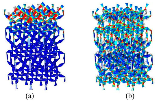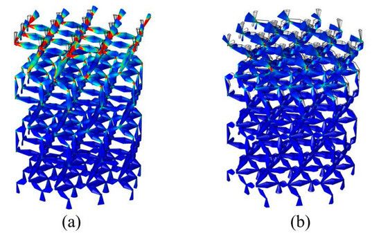 The von Mises stresses of pentamode metamaterials on harmonic loads in (a) horizontal direction (b) vertical direction.