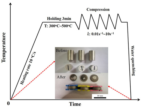 The ingots were homogenized in two stages (heated at 275 and 440 °C for 20 h and 12 h, respectively) before being cut into Φ10 mm × 15 mm cylinders. Gleeble-3500 was subjected to isothermal compression tests. All cylinders were heated up at 10 °C/s and held for 3 min before compression. The hot compression temperatures were 300 °C~ 500 °C (Temperature interval of 50 °C) with strain rates of 0.01, 0.1, 1, and 10 s−1. Figure 1 shows parts of the samples before and after compression, including the C alloy in the hot compressed state of 300 °C—0.01, 1, and 10 s−1. No macroscopic cracks were found in the appearance of all the samples after compression.