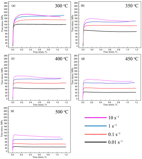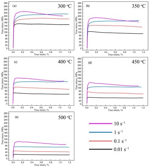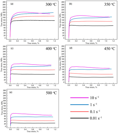 Hot compression true stress−strain curves of C alloy (5182−0.1Sc−0.1Zr alloy) at (a) 300 °C, (b) 350 °C, (c) 400 °C, (d) 450 °C, and (e) 500 °C.