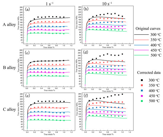 σo is the original flow stress, σc is the corrected flow stress, T, ε, and represent temperature, strain, and strain rate, respectively. ∆T is the actual elevated temperature. The corrected flow stress obtained by Equation (1) is shown in Figure 5. From the corrected data, it is found that significant hardening of the materials occurred at 10 s−1 (strain rate).