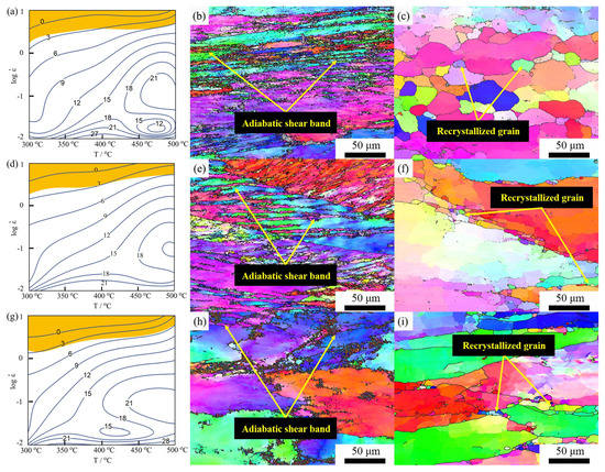 The processing maps of the three alloys and the corresponding microstructures (ε = 1.0) of/at (a) Alloy A; (b) 300 °C–10 s−1; (c) 500 °C–0.01 s−1; (d) Alloy B; (e) 300 °C–10 s−1; (f) 500 °C–0.01 s−1; (g) Alloy C; (h) 300 °C–10s−1; (i) 500 °C–0.01 s−1.
