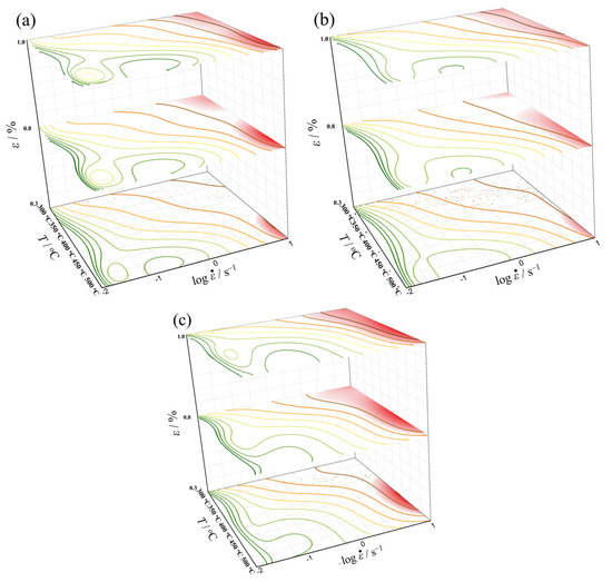 Processing map under different strains of (a) AA5182, (b) AA5182−0.05Sc−0.1Zr, and (c) AA5182−0.1Sc−0.1Zr.