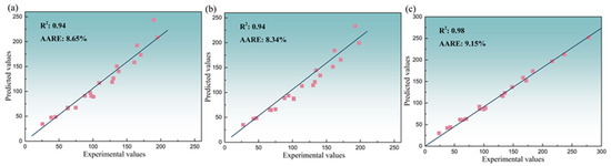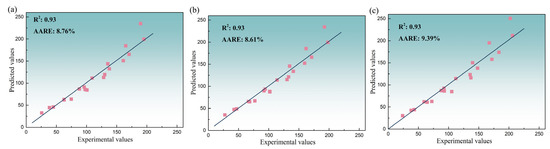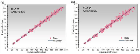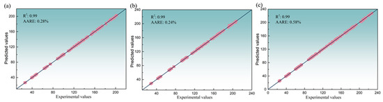 Figure 9 shows the comparison between the predicted and experimental values of the constitutive equations. The correlation coefficient between experimental values and predicted values commonly used to judge model accuracy is shown in Figure 9. R2 is improved slightly compared with values before modification.