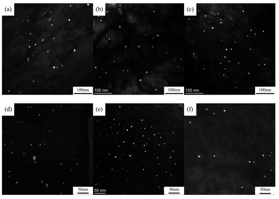 Dark field images of the Al3(ScxZr1−x) (a) AA5182−0.05Sc−0.1Zr, 300 °C, 0.01 s−1, (b) AA5182−0.05Sc−0.1Zr, 400 °C, 0.01 s−1, (c) AA5182−0.05Sc−0.1Zr, 500 °C, 0.01 s−1, (d) AA5182−0.1Sc−0.1Zr, 300 °C, 0.01 s−1, (e) AA5182−0.1Sc−0.1Zr, 400 °C, 0.01 s−1, and (f) AA5182−0.1Sc−0.1Zr, 500 °C, 0.01 s−1.