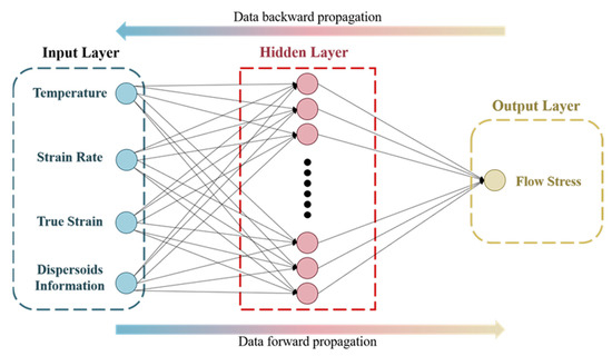 When modeling the thermal processing of materials, it is necessary to consider that nonlinear variables have an impact on flow stresses [22,23]. The current constitutive model is a mathematical representation of the link between experimental thermal compression and flow stresses. In the field of materials, promising machine learning algorithms can immediately acquire non-linear correlations between input parameters and output data without the requirement for assumptions or knowledge of the data’s mathematical or physical properties [24]. Because predicting thermal deformation flow stresses is a regression problem, machine learning algorithms that tackle classification problems, such as decision trees and vector machines, are not suitable for this work. Regression-solving artificial neural networks provide the advantage of introducing nonlinear elements and boosting model accuracy [25,26]. According to Ashtiani’s research, a neural network utilizing a feed-forward error back-propagation algorithm modifies the network’s hidden layer weights and thresholds using gradient descent to reduce the error between the target and predicted outputs [27]. In Sheikh−Ahmad’ study, a novel artificial neural network (ANN) construction method (training and verification) was successfully applied to the sparse high strain-rate regime [28]. The predicted values of the ANN model are more consistent with the original experimental data in the study on thermal deformation behavior of 5083 and 5754 alloys [29]. In previous hot compression studies, the artificial neural network models for alloys containing Sc and Zr were constructed on the basis of processing conditions, as in the constitutive models. The Al3(ScxZr1−x) dispersoids have a significant impact on the recrystallization behavior and strength of Sc and Zr reinforced aluminum alloys, and these effects should be factored into the neural network design [22]. In this study, Al3(ScxZr1−x) dispersoids information is introduced to establish an accurate flow stress prediction model using artificial neural networks.