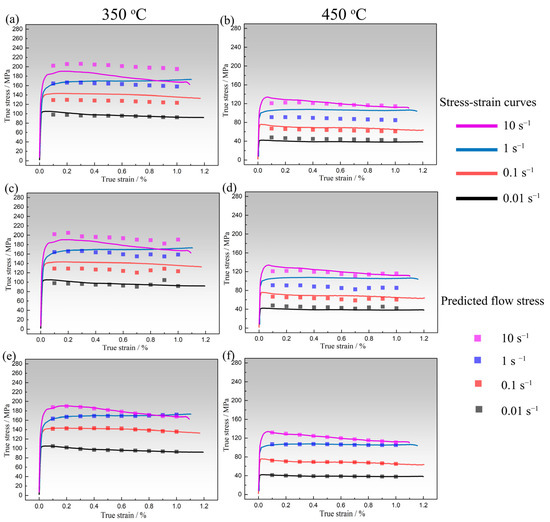 Stress−strain curves and predicted values of (a) constitutive equation at 350 °C, (b) constitutive equation at 450 °C, (c) strain−compensated constitutive equation at 350 °C, (d) strain−compensated constitutive equation at 450 °C, (e) ANN at 350 °C, and (f) ANN at 450 °C.