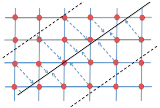 We can visualize the circumstance by considering that a n-dimensional quasi-periodic lattice can be viewed as the projection of a periodic array of mass points in a space of dimension onto an incommensurate subspace. Consider, for example, a square mass point lattice in a plane; take a straight line inclined by an irrational angle with respect to the orthogonal directions defining the squared structure. Then, project along the direction orthogonal to the line all lattice mass points in a strip around the straight line: the result is a one-dimensional quasi-periodic lattice over the line (Figure 1 visualizes the scenario).