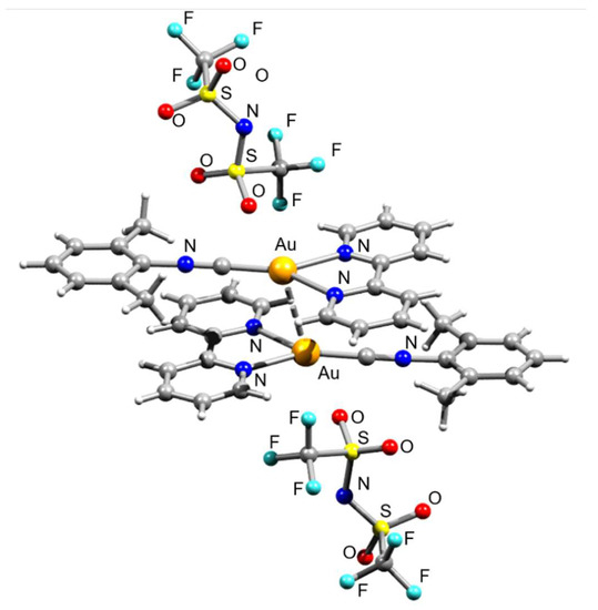Aurophilic interactions have been implicated in the intriguing luminescent features of metal complexes. The isocyanide complexes of gold(I) are versatile luminescent compounds that have attracted significant attention and often feature aurophilic contacts [9,10]. These attractive Au···Au interactions in isocyanide complexes are important since they influence the self-assembly of these materials in the solid state. Neutral linear aryl gold(I) isocyanide derivatives showed potential in the context of the exploration of their tunable photophysical characteristics in the solid state, which could be affected by aurophilic interactions [11,12,13]. Cationic linear diisocyanide gold(I) complexes also showed a propensity to self-assemble in the solid state in higher-order emissive aggregates via attractive Au···Au interactions [1,9,10]. Although the synthetic exploration of isocyanide gold(I) complexes is an attractive area, their structural diversity seems to be limited to linear gold(I) derivatives. Here, we describe the synthesis and structural characterization of the cationic three-coordinate gold(I) 2,2′-bipyridyl/isocyanide complex, which forms supramolecular dimers in the solid state via attractive Au···Au interactions, for the first time. In addition, we performed DFT calculations together with QTAIM, ELF, RDG, and NCI techniques and Hirshfeld surface analysis, which supported the presence of intermolecular aurophilic interactions in the solid state.