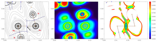 Laplacian of electron density distribution ∇2ρ(r), visualization of electron localization function (ELF), and reduced density gradient (RDG) analyses (left, center, and right diagrams, respectively) for aurophilic interactions Au(I)···Au(I) in the X-ray structure 4. Bond critical points (3, –1)—blue, nuclear critical points (3, –3)—pale brown, ring critical points (3, +1)—orange, bond paths—pale brown lines, length units—Å; the color scale for the ELF and RDG maps is presented in a.u. The bond critical point (3, –1) for aurophilic interactions Au(I)···Au(I) is indicated by black arrow in left diagram; the blue area of reduced density gradient, very typical for noncovalent interactions, is indicated by black ellipse in right diagram.