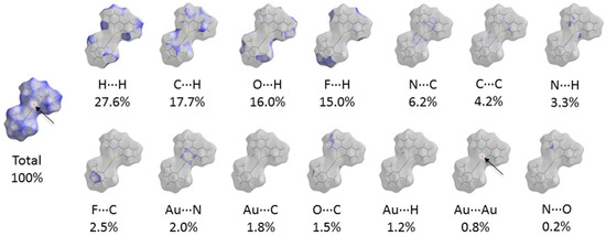The crystallographic data analysis suggests the existence of the aurophilic interactions Au(I)···Au(I) in the crystal structure 4. Indeed, the distance between appropriate metal centers (viz. 3.216 Å) is significantly lower than the sum of their shortest van der Waals (vdW) radii (viz. 3.32 Å; note that currently, several values of vdW radii for gold are proposed, from the “classic” 1.66 Å radii [22] to “modern” 2.32 Å radii [47]. In order to confirm or disprove the hypothesis of the existence of such intramolecular noncovalent interactions in the X-ray structure of 4, the DFT calculations together with QTAIM, ELF, RDG, and NCI techniques [48] were carried out at the ωB97XD/DZP-DKH level of theory for the model structure (see Computational details and Table S1 in Supporting Information). The QTAIM analysis of the model structure revealed the presence of the bond critical point (3, –1) for the aurophilic interactions Au(I)···Au(I) in the X-ray structure of 4 (Figure 2 and Table 1). The values of the electron density, Laplacian of electron density, and energy density in the bond critical point (3, –1) for the aurophilic interactions Au(I)···Au(I) in the X-ray structure of 4 are typical for metallophilic interactions in similar chemical systems [49,50,51,52]; the ratio –G(r)/V(r) < 1 reveals some small covalent contribution in this short contact [53], and the sign of λ2 (λ2 < 0) suggests that these interactions are attractive [54,55]. The estimated energy of the aurophilic interactions Au(I)···Au(I) in 4 (Eint ≈ –V(r)/2) [56] is 6.3 kcal/mol. The visualization of intermolecular contacts in 3D using the noncovalent interaction analysis (NCI analysis) technique and the scatter graph of RDG vs. the product of sign of λ2 (second largest eigenvalue of the Hessian matrix of electron density) and ρ (electron density) (NCI plot [54]) for 4 are shown in Figure 3. To understand what kinds of intermolecular contacts have the largest contributions to crystal packing, we performed the Hirshfeld surface analysis for the X-ray structure of 4 (Figure 4). We found that intermolecular contacts involving hydrogen atoms (viz. H···H, C···H, O···H, and F···H) have the largest contributions to crystal packing. The fingerprint plots from the Hirshfeld surface analysis for the X-ray structure of 4 are given in the attached zip archive (Supplementary Materials).