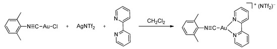 Following our interest in the isocyanide complexes [23,24,25,26,27,28,29,30], triple CN bond activation [31,32,33,34,35,36], and noncovalent interactions [37,38,39,40,41,42,43,44], the gold(I) complex 4 was prepared in a high yield by the sequential addition of AgNTf2 (2) and 2,2′-bipyridyl (3) to chloro(2,6-dimethylphenyl isocyanide)gold(I) (1) in CH2Cl2 as a solvent (Scheme 1).