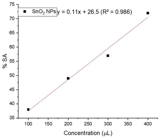 The antioxidant activity of the prepared SnO2 nanoparticles is investigated by ABTS free radical scavenging activity, which decolorizes when scavenged. Figure 7 depicts the percentage scavenging activity with regard to sample concentration. The antioxidant performance is increased with the rise in sample concentration, as illustrated in Table 4. The amount of reactive species is increased with SnO2 nanoparticles concentration, and therefore, the ability of sample to combat the reactive ABTS•+ free radical is also increased, increasing the radical scavenging capacity of SnO2 nanoparticles [29]. The calculated IC50 value is 213.64, which is closer to the value reported elsewhere [30].