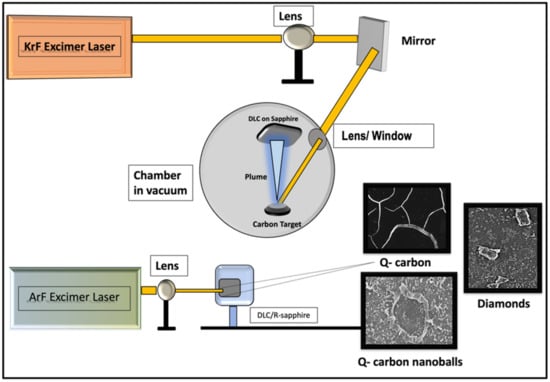 Therefore, PLA melts the amorphous carbon into a highly undercooled state of molten carbon and subsequently quenches the undercooled state to form Q-carbon, Q-carbon nanoballs, or diamond, depending on the degree of undercooling. The schematic of PLD and PLA process is shown in Figure 1, where the laser beam is reflected (by the mirror) and focused on the carbon target for the film deposition. In the second step, the deposited films are annealed with ArF excimer laser pulses.