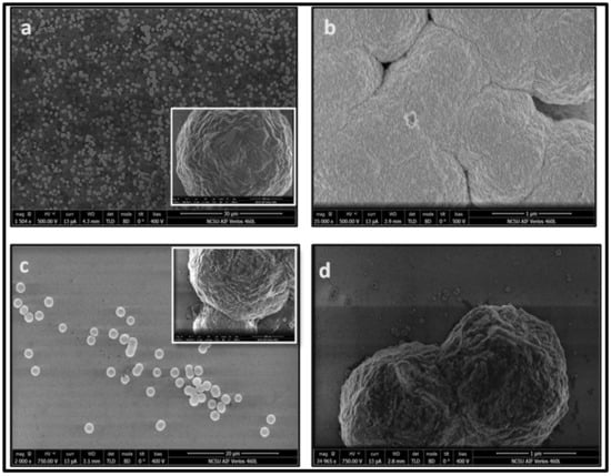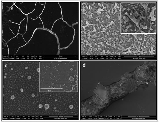 Figure 3 shows high resolution scanning electron microscope (SEM) images of the samples annealed at different energy densities. At the laser energy density of 0.6 J cm−2 (Figure 3a), we see the formation of Q-carbon layer near the substrate interface with the α-carbon overlayer, in which cracks are formed upon quenching due to differences in the coefficients of thermal expansion of Q-carbon and α-carbon layers. At the laser energy density of 0.7 J cm−2, we observe the formation of Q-carbon nanoballs (Figure 3b). These samples also contain embedded nanodiamonds, which nucleate and grow from these Q-carbon structures. This agrees with previous reports demonstrating that the Q-carbon phase provides nuclei for diamond growth []. It is interesting to note that these nanoballs are self-organized in the form of rings. The formation of ring structures occurs as a result of diamond tetrahedral alignment along the <110> direction, where these tetrahedra can pivot along the <001> direction to form a ring structure []. These nanoballs have a fairly uniform size of about 50nm. We see nanocrystallites coagulated with each other to form bigger clusters, leading to the formation of other functional structures []. On increasing the energy density of the laser to 0.80 J cm−2 and 0.85 J cm−2, we observe the formation of microdiamonds and nanodiamonds. The structure of Q-carbon consists of diamond tetrahedra with center atoms, which are arranged randomly with the bonding within the tetrahedra sp3 and in between sp2. It should be noted that in the diamond, each unit cell has four tetrahedra with a center atom and four tetrahedra without them. During laser annealing, the formation of different structures depends on the substrate thickness, the sp3 to sp2 ratio governed by the laser energy density, and the conductivity of the sample. The Figure 3c shows a uniform distribution of nanodiamonds throughout the sample. The inset shows a large-area nanodiamond coverage, whereas Figure 3d shows that at 0.8 J cm−2 there is a formation of single and cluster microdiamonds and nanodiamonds on r-sapphire. These platelet-looking microdiamonds are all oriented in a <100> direction with respect to the substrate leading to epitaxial growth. The surface morphology of these diamonds appeared more homogeneous with the film comprising of highly dense packing of these nanodiamond crystallites having defined edges in (c). Such nanodiamond structures can be doped with N and Si to form NV and SiV color centers, which are needed for nanosensing and quantum computing applications. These nanodiamonds range in size from 5 nm to 20 nm. Our previous studies have demonstrated that it is possible to trap a single NV center in a 5 nm nanodiamond within the bulk rather than at the surface for larger sizes, in agreement with theoretical calculations [].