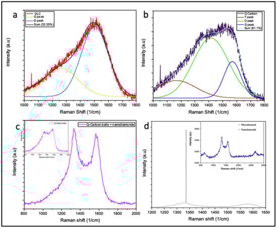 The bonding characteristics of these carbon polymorphs were studied by using Raman spectroscopy, as the Raman peaks provide signature bonding relations in different structures of carbon. Figure 4 shows the Raman spectra of the four samples. It is well known that PLA on DLC films changes the sp3 and sp2 content in the films [,,]. The as-deposited DLC coated sample shows an amorphous carbon peak broadening with the sp3 content of about 32%, as shown in Figure 4a. During PLA, we form sp3 rich phase of Q-carbon due to higher undercooling and rapid quenching. The Q-carbon spectrum confirms the presence of Q-carbon formation with an increased sp3 content of roughly ~81% with the flatter curve with peaks between 1340 cm−1 (D) and 1560 cm−1 (G). A small peak near 1140 cm−1 is associated with strained sp2 carbon at the interface of the sp3 nanoclusters, as shown in Figure 4b. Gaussian distribution was used for curve fitting and deconvolution of the peaks.