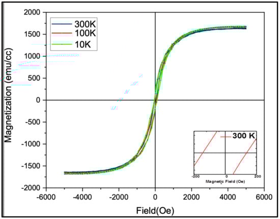 The Q-carbon demonstrates robust coercivity and associated ferromagnetism at room temperature due to the presence of dangling bonds with unpaired spins at the sp3/sp2 interface []. The formation of Q-carbon is further confirmed by the magnetic results. Figure 5 shows the magnetization vs. the magnetic field plot of the Q-carbon sample. Controlled samples containing only diamond, diamond-like carbon, and sapphire substrate exhibit only diamagnetic behavior, which was subtracted in the represented magnetic plots. There is a typical ferromagnetic loop having a finite coercivity, observed with the variation of temperature (10 K, 100 K, and 300 K), as shown in Figure 5. The room temperature ferromagnetism is observed in Q-carbon with a finite coercivity of 57.5 Oe. The coercivity at 10 K is 76 Oe, which decreases with the increase in temperature. DLC film shows the diamagnetic behavior before laser annealing [].