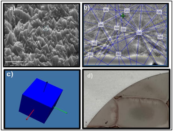 Figure 7a shows the formation of <100> oriented crystalline diamond over a large area. These crystallites have {111} facets with <100> axis normal to the substrate. Figure 7b shows the EBSD pattern at 70° and Figure 7c shows the corresponding orientation relationship diagram to confirm the crystal structure of the <100> diamond growth. The formation of this microstructure with sharp edges is ideal for field emission and display device applications. The domain matching epitaxial alignment of (100) diamond on (101 2) sapphire is as follows: <200> diamond //< 2(11) 0> sapphire along a- axis, and <020> diamond //<−1101> along b-axis. This misfit over 25% can be handled by the domain matching epitaxy, where the integral multiples of the film and the substrate planes match across the interface []. The Figure 7d shows the wafer-scale integration by the overlapping of laser pulses to create large area Q-carbon/ diamond structures. The capabilities of 100 Hz in our ArF laser system creates the output of 100 cm2 s−1.