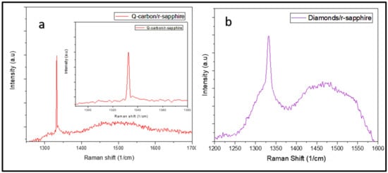 The spectrum of Q-carbon balls embedded with nanodiamonds gave a peak at ~1330 cm−1, as shown in Figure 4c. Diamond is a monoatomic system, with a first-order peak with the symmetry T2g at 1332 cm−1, which is the only Raman active mode. This mode in diamond corresponds to the vibrations associated with two interpenetrating cubic sublattices []. Formation of nanodiamonds is attributed to a high undercooling, which causes homogeneous nucleation in the melt state. Figure 4d shows the nanodiamond peak at 1328 cm−1, which is a red shift (of 4 cm−1), and the spectral broadening is due to the phonon confinement effect in nanodiamonds, as shown in HRSEM. The 1334.1 cm−1 peak is observed with microdiamonds, which shows a blue shift due to stress in the film. This is a characteristic diamond peak obtained on the platelet-looking microdiamonds, as shown in Figure 3d. The growth orientation depends on DME (Domain Matching Epitaxy) and the substrate having 2-axis symmetry, which promotes <100> growth for the r-sapphire. These microdiamonds are all oriented in a similar direction with respect to the substrate, which corelates to the DME growth of the <100> diamond on r-sapphire.