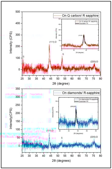 We carried out XRD analysis to confirm the formation of (111) or (100) diamond. XRD is a powerful characterization tool for the analysis of the stress value averaged over the entire film []. Figure 9 shows the XRD results of the films. In the Q-carbon sample, we see (111) a characteristic diamond peak at 2θ of 43.9°, and (220) peak at 75.4° []. We observe a relatively lower intensity of the (111) peak in the diamond sample showing the peak at 43.88°. The relative intensity of the (111) diamond peak is related to the coverage in the film in agreement with the SEM results. A (220) peak is observed at 75.38° in the diamond-seeded sample. We performed a grazing incidence XRD analysis to account for small intensity peaks from the substrate. We observe tiny sapphire peaks at 25.8° and 52.9° from the (102) and (204) planes. To find the average crystallite size, we use the Scherer equation: